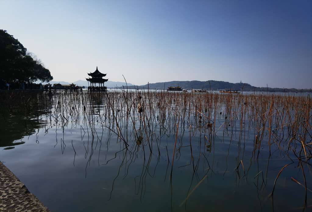 饭后,直奔西湖边。这是我们多次与西湖相遇,感受到人流最壮观的一次。人墙把西湖围了起来,不走到近前,根本无法看到西湖美景的真容。好的地点,取景拍照点要排队,乘船买票要排队,要想照张不是大合影的单人照片,真是挺有难度的。我们跟随着人群,从音乐喷泉附近沿西湖岸向南慢慢挪动,电瓶车缓缓地穿梭于人群中,每辆车都座无虚席的,转角处,又见到了之前多次出现在我们西湖的照片中,那个熟悉的小亭子。