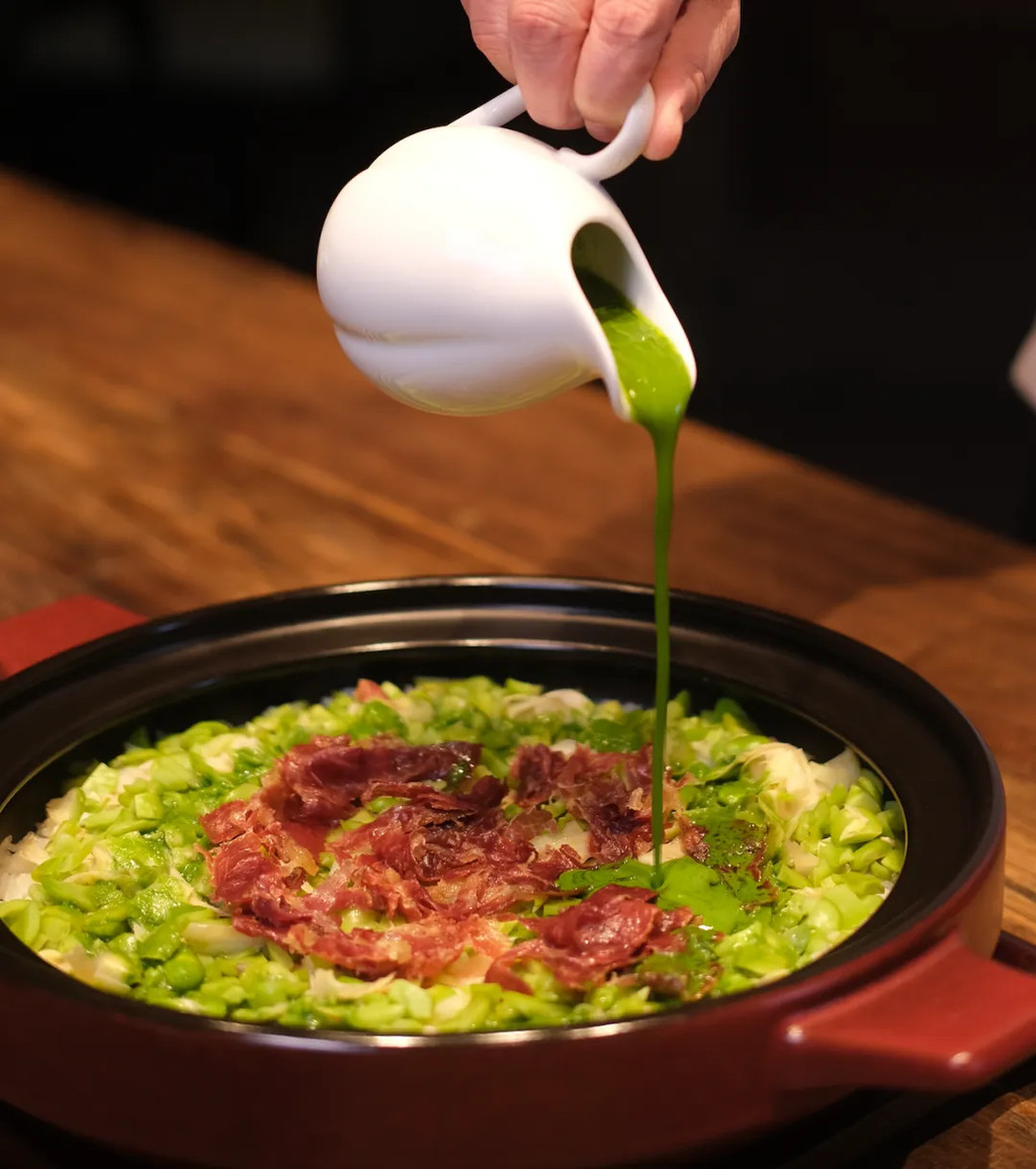 程主厨的春季菜系,就在这山野间铺陈开来,他说:“笋那是必须的!我还挑了些时令季节的蔬菜,蚕豆、韭菜、马兰头这些。等蚕豆上市,富春江鲫鱼就来了,煎好,鲜的不得了。”