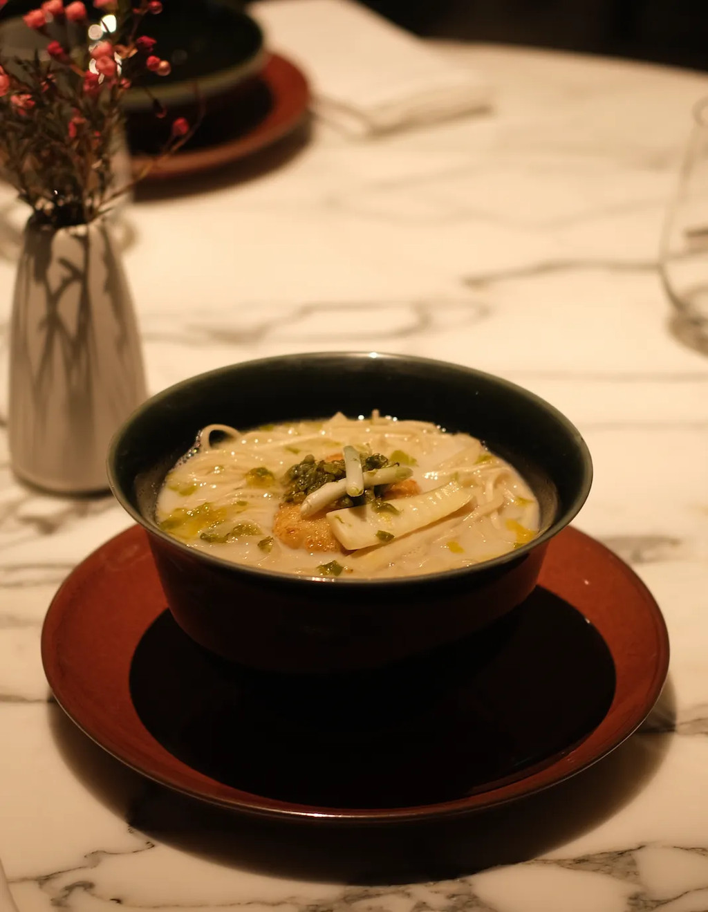 谁知道,程师傅一碗吃过就忘不了的倒笃菜黄鱼面,东海的金亮黄鱼,肉做浇头,骨头熬汤。连顶上一点倒笃菜,都经历了万水千山。