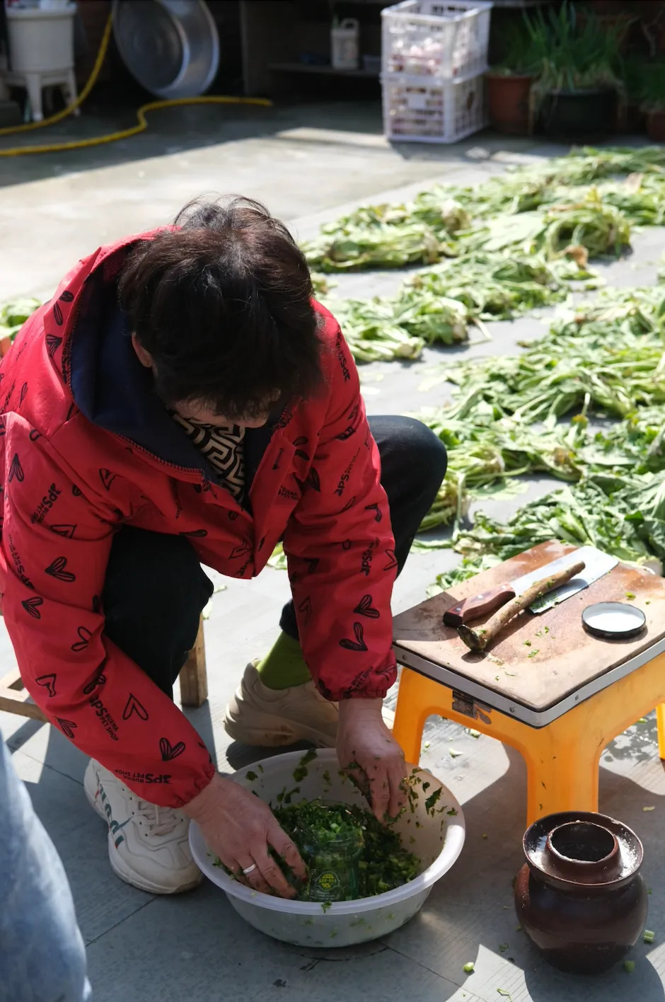 我们平时买到的倒笃菜很多有点发黑,阿姨说,其实是储存不当。阿姨说,腌渍好的咸菜应该分小份放在速冻里,要吃的时候解冻。我心里在想,科学发酵也是要控制进程的,在黄金时间及时阻断,才能保证品质。