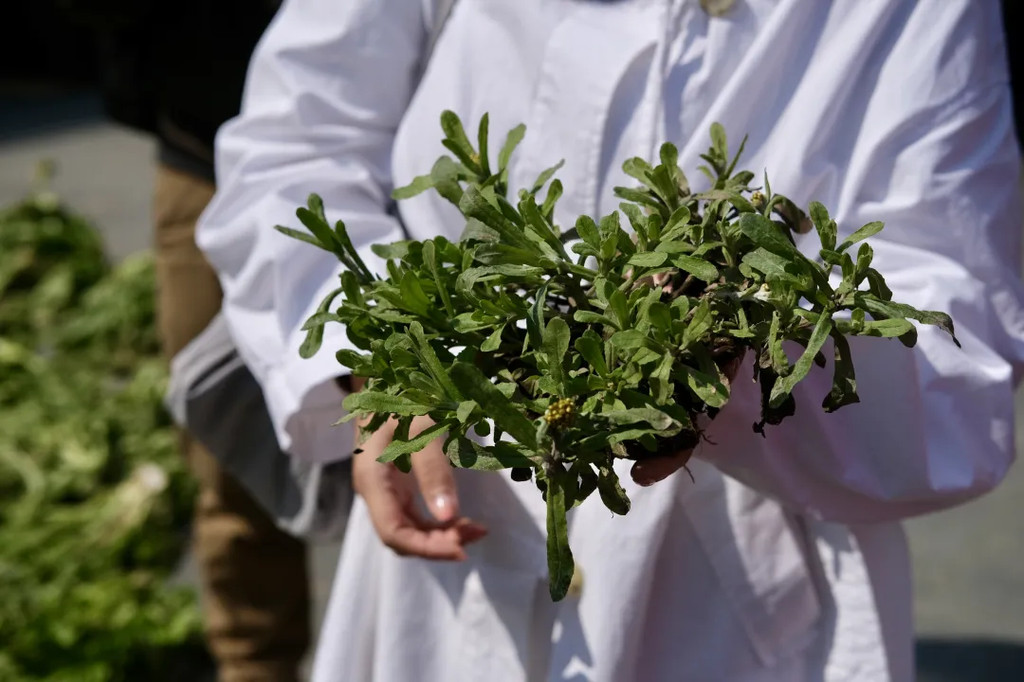 “除了吴葱,你可能会看到松花粉,一定得是马尾松的松花粉,这是杭州人做松花糕的重要食材。做的考究的话,要用模子把米粉混合上糖,再混上一些去了皮的绿豆泥,刻出来后,再把松花粉撒上去。”陈老师说。