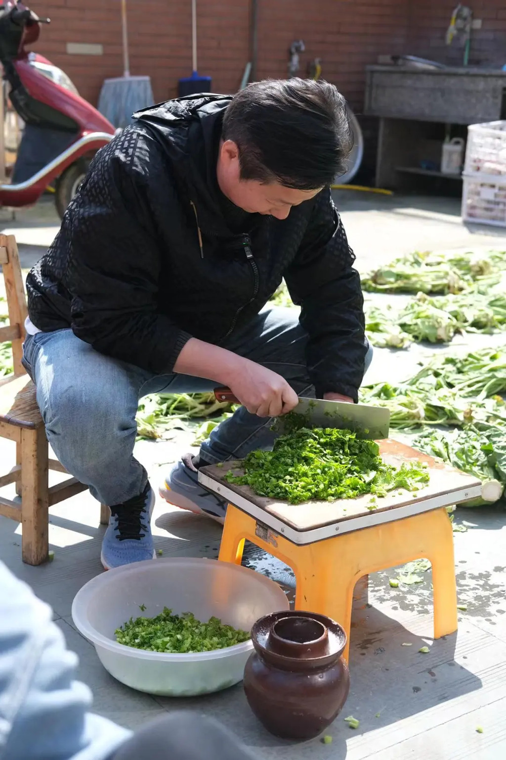 程师傅为一探究竟,和阿姨切磋了不少技术问题。“先把菜洗干净,稍晒太阳,晒干后切好,再摊开来晒,放些盐揉一下,第二天再继续放盐,重复揉,很麻烦的,之后紧紧塞进坛子,一定要紧,不然不好吃,过两天再把它倒过来,就行了。”