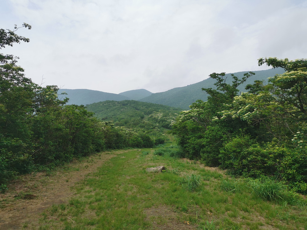 上行山路比较陡些,穿行在竹林,间断有几株高大的松树,然后是灌木—大概海拔九百左右,再过去一会就穿出树林,蓦然的防火道就在眼前,霎时间豁然开朗,两个方向:右转是药王峰-千亩田,左转是龙王山,然后整个线路直到山顶都是在宽阔的山脊线防火道上…路上已经有前一天晚上在山上露营的驴友开始下撤,而后面遇见一位拟穿越徒步45公里的…