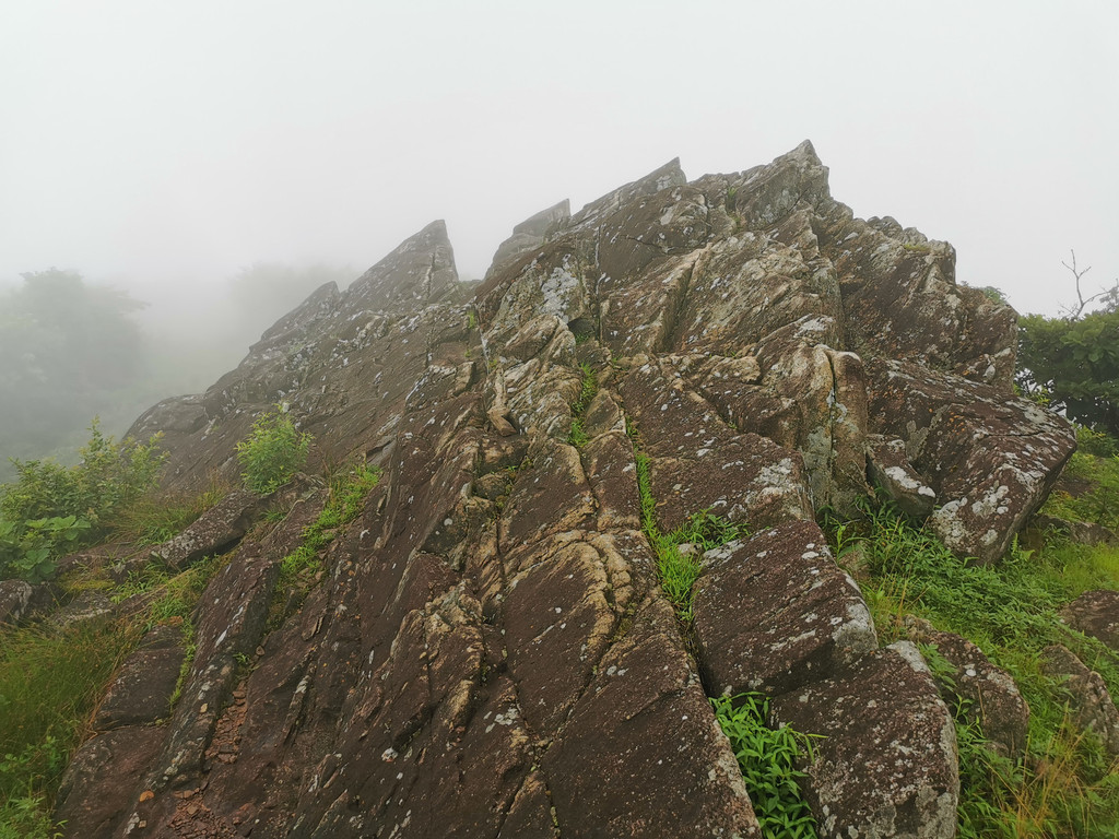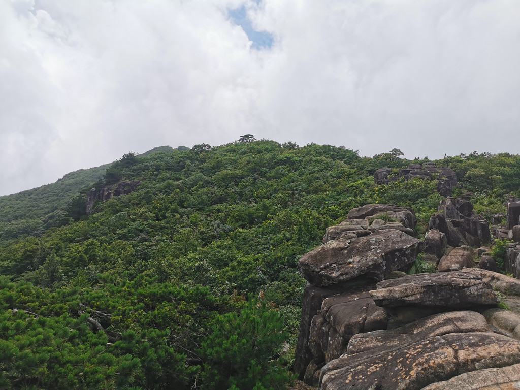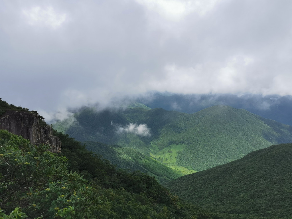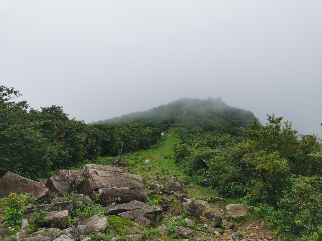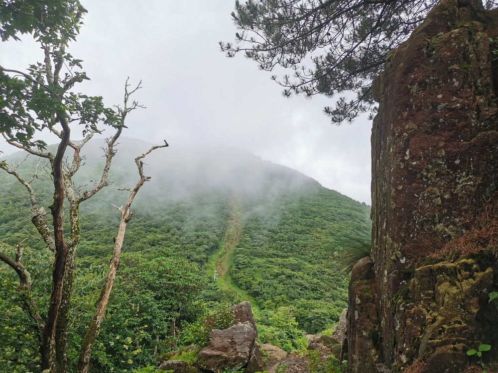 临安区大地之野之前去龙王山的线路上到山脊线三叉路,左手龙王山方向,右转往药王峰。天气预报小雨,还好是阵雨小雨,山脊线上药王峰刚开始一段下雨,后边多还好;山道好几处上下只有能够踩一只脚的,千亩田后面下雨泥石路很容易打滑,以后是尽量不在雨天上山。可或许也正是下雨,雨歇后山顶云雾散开去,站在山巅感受着山野间清风拂过,放眼望去,只余下青天、白云、远山、空谷、鸟鸣…
