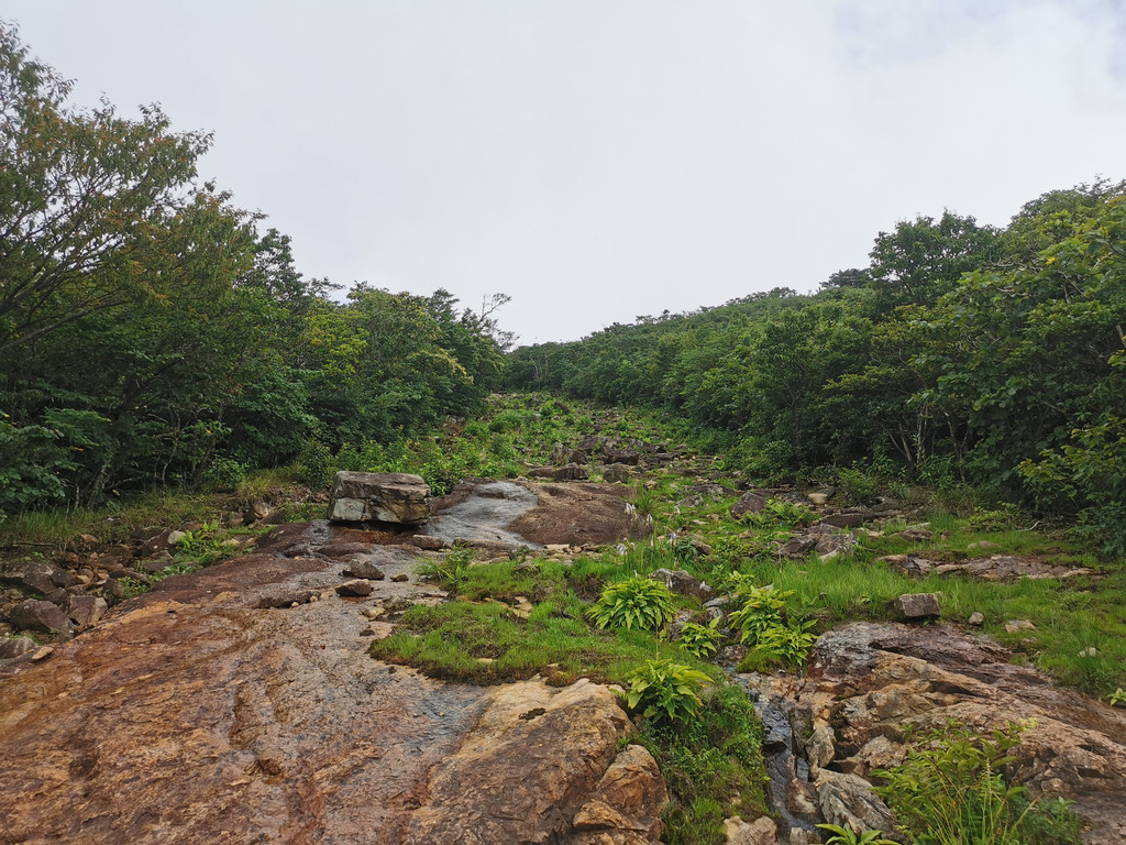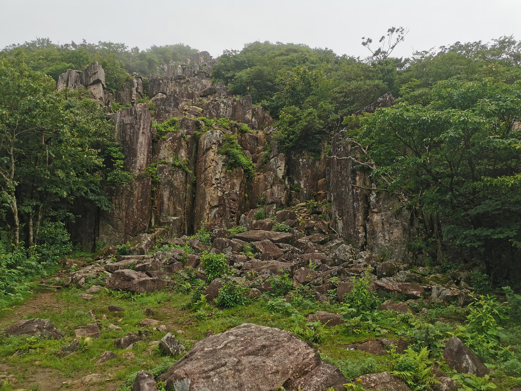 药王峰又名节理峰,据说是亿万年前火山喷发后遗存的地质地貌,每座山峰大自然造化天成、岩石风貌各不相同却又多是壮观奇绝…所以有说法,药王峰是天目七尖山峰中最美的一座,果然是不虚。药王峰上可远眺千亩田、千亩峰,下山时两个陡坡上有前人户外山行留下的下降绳索,得以借力方便许多。千亩田下山,因为下雨的缘故,部分山路快成了小溪沟;山涧里溪水汇流,一路上冲突、轰鸣、跳跃而下…