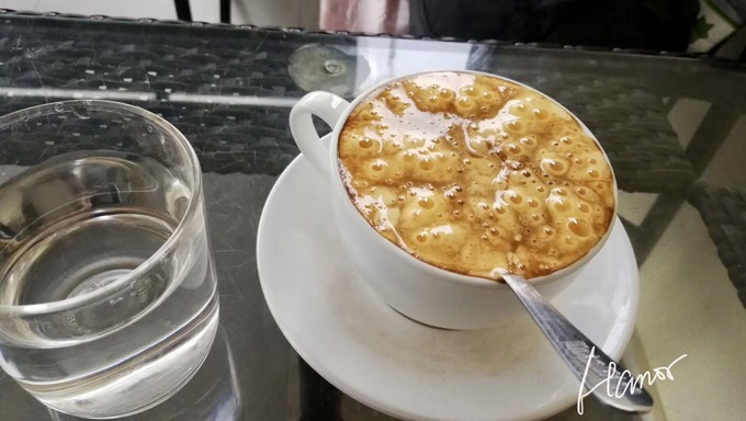 鸡蛋咖啡大概就是将鸡蛋打发,做成奶霜状,吃起来像一杯甜品,鸡蛋奶霜是甜甜的带着鸡蛋的腥味,奶霜下面是纯粹的黑咖啡,受不了这苦的我拼命搅拌混合,终是徒劳无功;