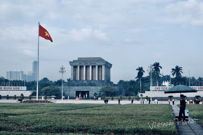 纪念馆保存着 越南 国父胡志明主席的水晶棺,其双手交叉于胸前,嘴角含笑,面容安详,十分肃穆;从纪念馆出来,便可取回相机,在巴亭广场有限的区域里活动。