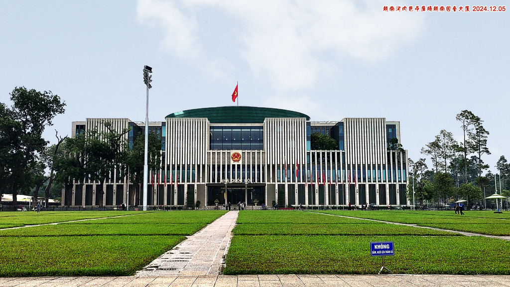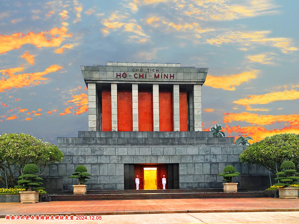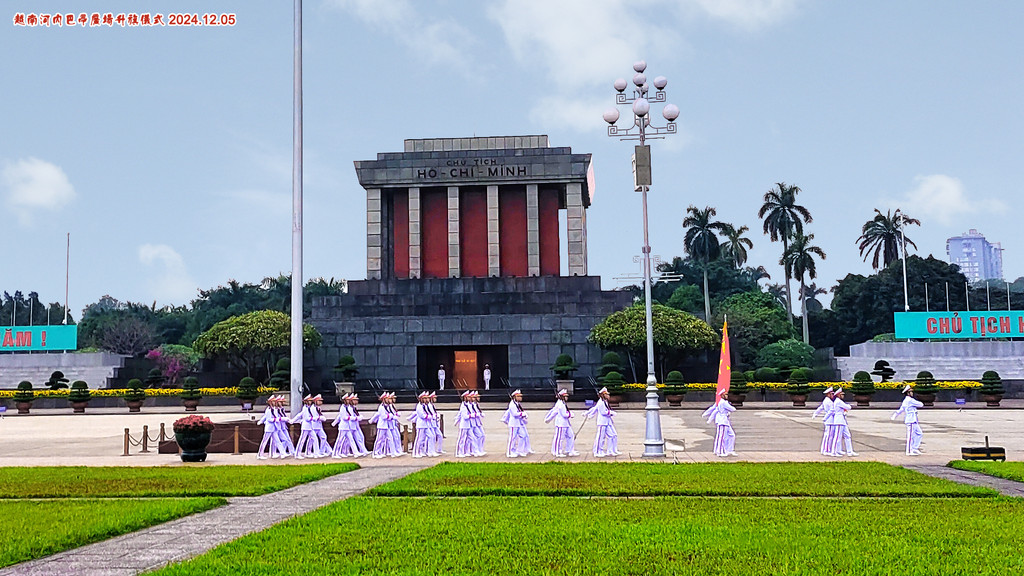 12.06日星期六,早下火车后乘大巴直接去巴亭广场。参观胡志明陵外景(☆☆),观看升旗仪式(☆☆),参观越南主席府(☆)、国会大厦(☆)、胡志明故居(☆)、小木屋(☆)等外景,游览独柱寺(☆☆)。车观国家歌剧院(☆)、中国住越南大使馆(☆)等。