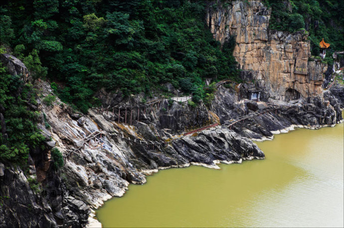 走过栈道,可以去大坝的下游,隔着一百多米的距离欣赏一下古老的栈道,那不过是几十米的残留,很委屈地盘旋在大坝的旁边,有木板凌乱地堆在那里,也不知道堆了多少年。一条横跨秦岭天险,贯通南北的褒斜栈道,一处在世界交通史上享有盛名的石门隧道,一项由汉初丞相萧何倡修的山河堰水利工程,就只剩下这么一段了!仅仅是如此短的一段,已经可以窥见当年褒斜道的陡峭与建设的艰难。想想看,五百华里的长度,多少个孔,多少的洞,多少的人工才能创造出那样的成就,一条天路盘旋在群山峻岭之间,一会儿从崇山峻岭中穿过,一会儿又“飘”在云山雾海的半空中的感觉是何等的壮观?!那一弯弯直插天穹的山道,那一段段贯穿山峦的隧道,那一道道高耸陡峭的边坡,无不见证了奇迹的诞生!