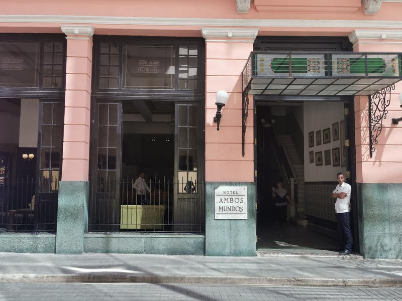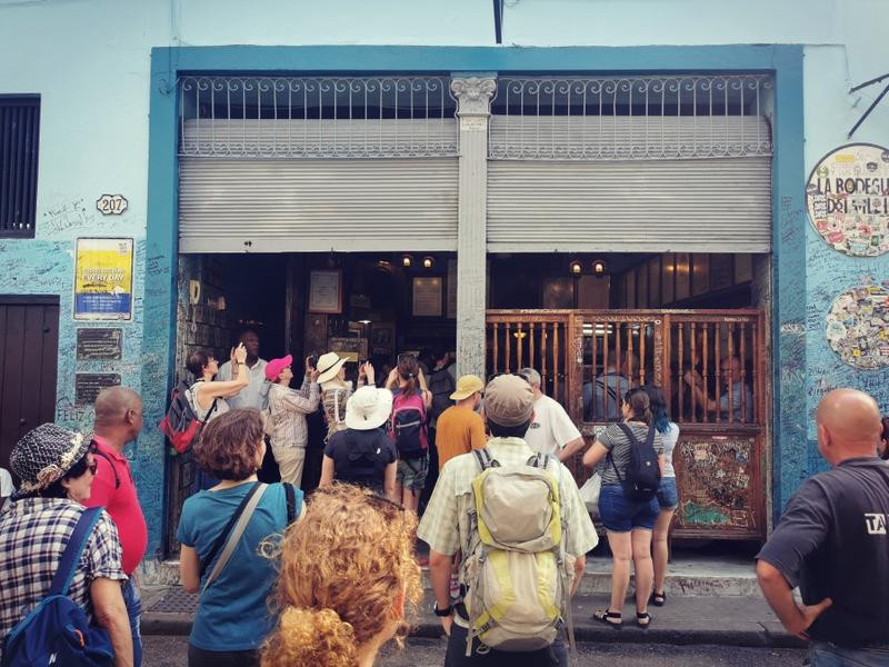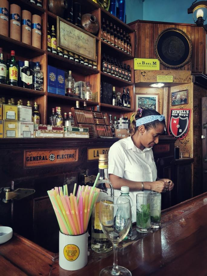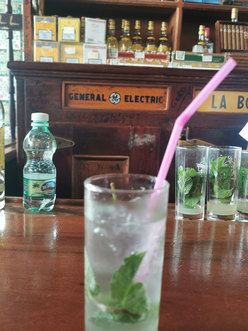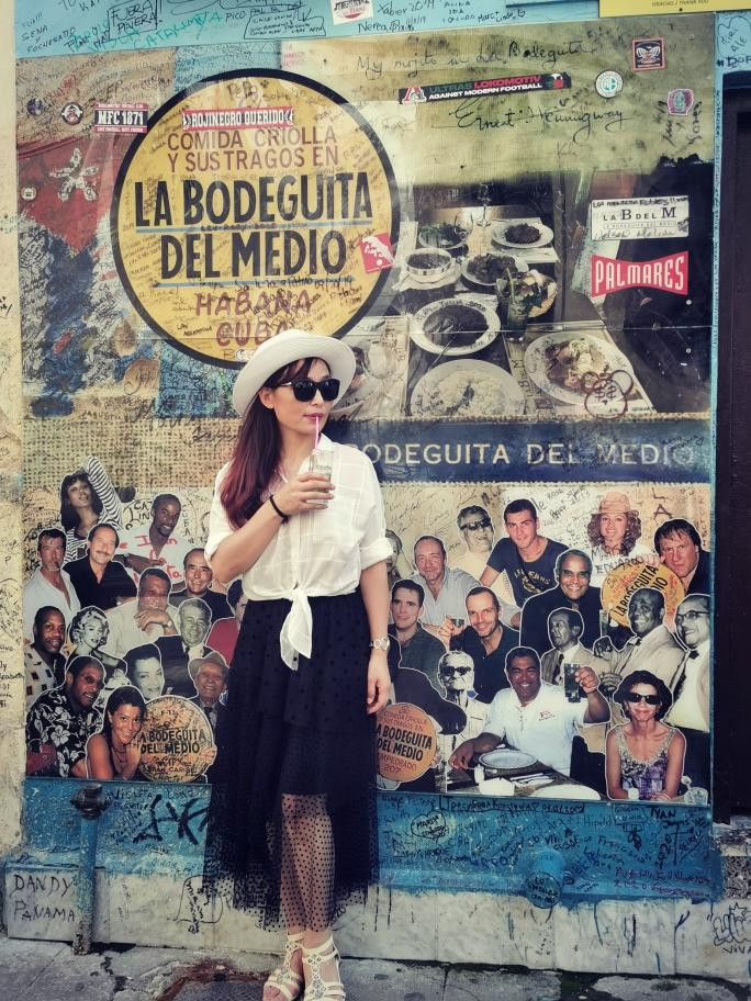 哈瓦那老城里最著名的莫过于五分钱小酒馆,之所以出名是因为著名作家海明威曾经经常在此喝酒,这里的莫吉托是哈瓦那最有名的鸡尾酒,是用朗姆酒等五种材料调配而成。我们慕名而来,肯定不能错过此饮品,于是,在一帮五大三粗的欧美人中间,我们力克群雄,总算买上两杯莫吉托。