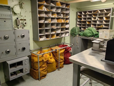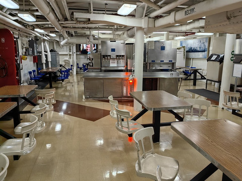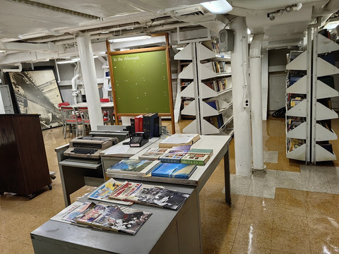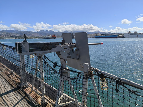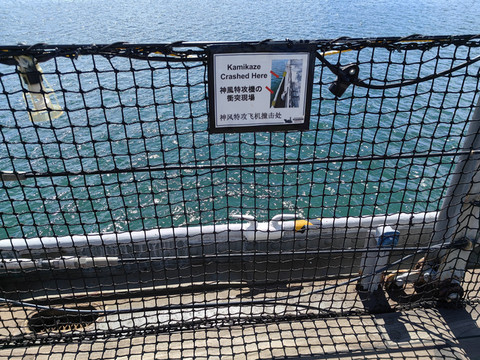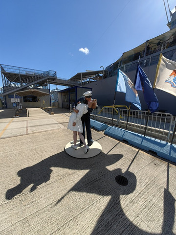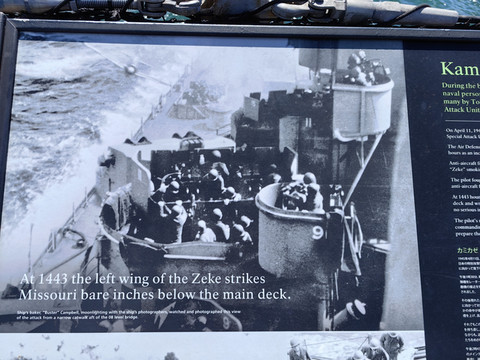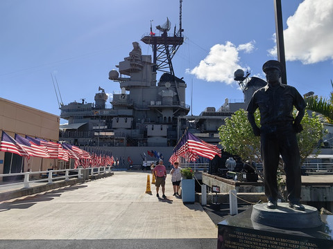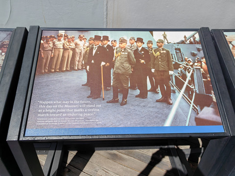 大巴驶出游客中心,过桥前往福特岛,巴士通过福特岛的海军基地时,游客不可以拍照或视频拍摄。巴士抵达密苏里号战舰纪念馆后,游客下车,验票后依次登船。那天参观的人不算多,一位操着南方口音的中文导游带领我们三人游览战舰。他带领我们游览了一层甲板,介绍了舰首尾的大炮、为何铺设木质甲板等,重点介绍了当年日本签署无条件投降书的情况和签字地,还介绍了二战期间一架日本战机撞击甲板事件。将近一小时的介绍,让我们了解了那段历史和传奇故事。谢过导游后,我们进入内部游览一番。而后,又乘坐大巴经过航空馆后回到游客中心,购买了纪念品后驱车返回酒店。