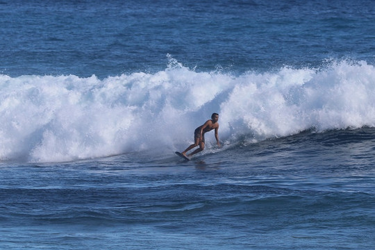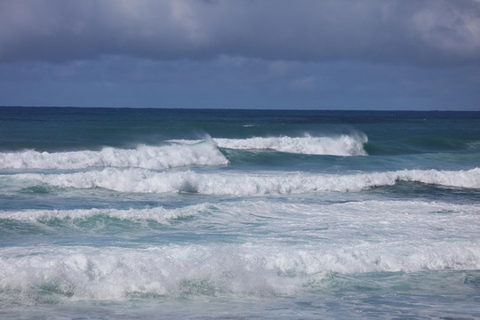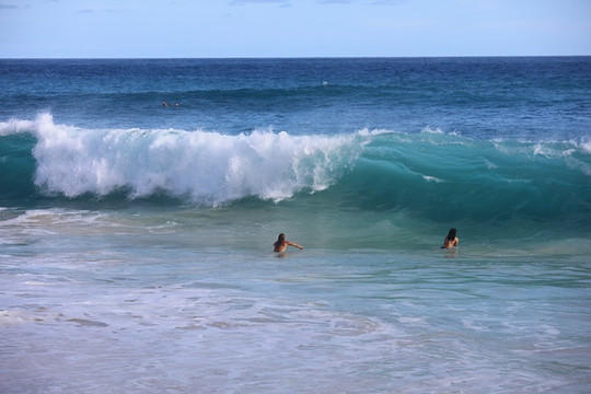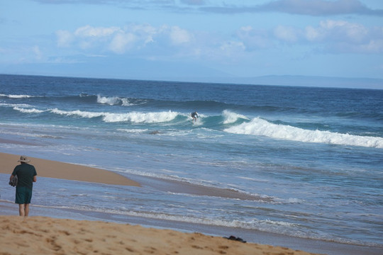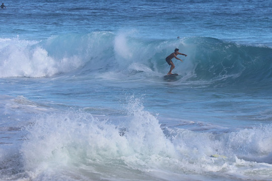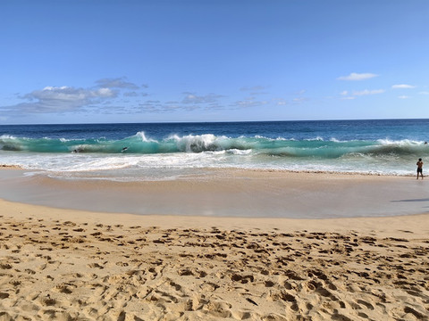 从Halona Blowhole Lookout前行约2-3分钟,到桑迪海滩Sandy Beach。桑迪海滩是冲浪胜地,设有停车场、厕所、更衣室以及淋浴设施,有一些稀疏的树可以遮阴。我们将车停下,在海滩上欣赏冲浪。一人多高的卷筒浪频频拍打沙滩,这才叫后浪把前浪拍在沙滩上。桑迪海滩的海浪比较大,可看到冲浪者在冲浪。有的游泳者站在海里,迎着高大的海浪,腾空跳起跃进海浪,勇猛果敢。
