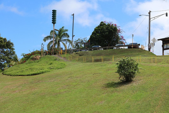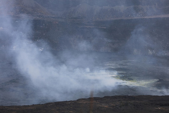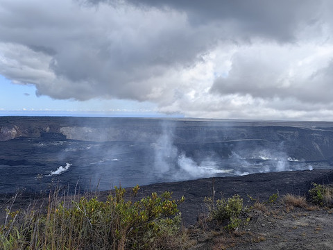 从这里折返,往回走,再次路过毁灭小径、熔洞、公园大门、游客中心等处,前往基拉韦厄火山口观景台(Kilauea Overlook)。车是沿着火山口边缘开的,可以从不同角度看到冒着白烟的火山口。过游客中心不久,左侧是地热蒸汽观赏点(Steam Vents, Steaming Bluff),能看到白雾缭绕。再向前几分钟就到了基拉韦厄火山口观景台和贾格尔博物馆(Jaggar Museum),有停车场。在观景台能完整饱览这个巨大的火山口主坑,坑底部分布着许多冒着白烟的裂缝,据说,晚上能看见红色火光。贾格尔博物馆以著名的火山学家托马斯·贾加尔博士的名字命名的,展示了科学家研究火山的设备、监测火山的地震仪等,现已关闭。到这里环绕火山口的环形路线到头了,前面被火山喷发损毁了。此地距离公园的游客中心2.5英里(4公里),开车只需10分钟。火山公园的几个著名的景点就都转过来了,即刻前往普纳鲁吾黑沙滩Punalu'u Black Sand Beach和卡拉埃Ka Lae(South Point)。