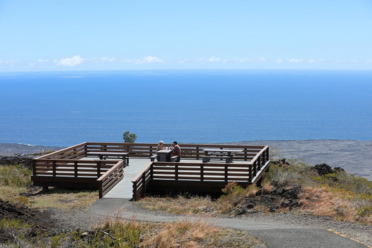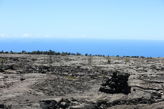 来到Kealakomo眺望台(Kealakomo Overlook),游客纷纷停车,到熔岩上行走拍照。坚硬的熔岩还保留着当时冲刷挤压的形状,高低不平。熔岩上有堆砌的锥型石碓,不远一个,向前延伸,这是路标,在熔岩上沿着它行走不会迷路。