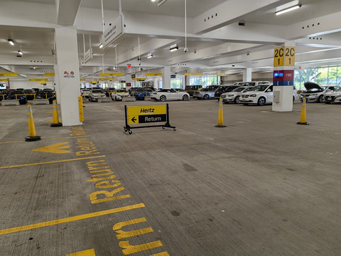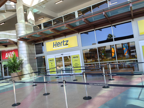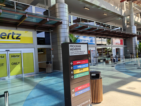Hertz租车公司设立在机场区域内,位于机场出口对面,隔着一条不足10米宽的马路,一排各个租车公司的柜台。