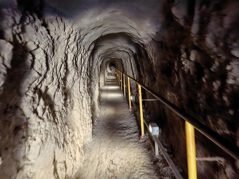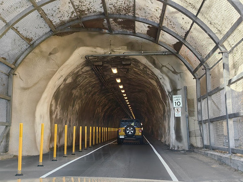 车进入树林行驶,不远处有一队人骑马前行,悠悠哉哉。车到半山坡一处废弃工事隧洞前停下,隧洞里是二战留下的许多物品,包括日本兵的用品,还有许多在这里拍过的影视片招贴画,一些实物场景。走出洞外,驾驶员给坐进一辆没窗户的车上的人们拍照。洞外公路美景如画,下面沿海公路曲曲折折,不同颜色的大海和朵朵白云交相辉映。众人纷纷留影,一队ATV车队过来,驾驶员和乘客们都蒙着面(许多路面是土路),犹如盗贼,缓慢而过。
