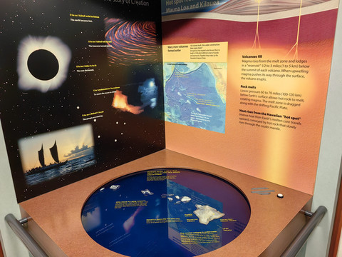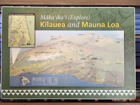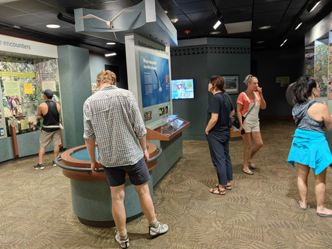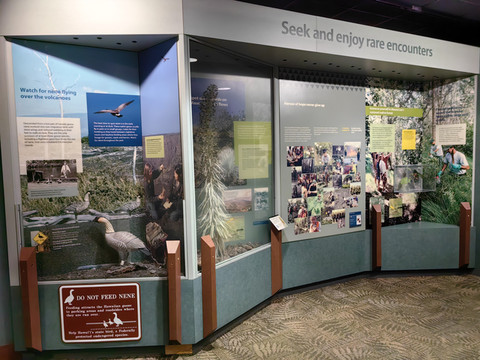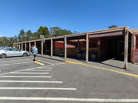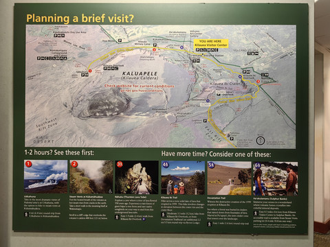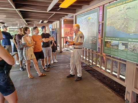 开车入园右转,几分钟后就能到达基拉韦厄访客中心Kīlauea Visitor Center。在游客中心能获取最新的火山状态、徒步信息、工作人员引导活动、路况和安全守则。网上说,这里还播放25分钟的介绍影片“Born of Fire, Born of the Sea”(生于火,生于海),我在那里没看到。在中心外面,1名工作人员在给游客讲解有关公园的情况,语言一定是幽默风趣,引得大家阵阵欢笑(我是听不懂)。屋内身穿制服的工作人员在对游客做一些园区介绍。墙上有详细的路线介绍,进门右侧售卖各式纪念品,左侧有一个小型博物馆,展示着一些标本、夏威夷群岛的变迁、火山的形成等等,在游客中心没看见中文地图。基拉韦厄游客中心开放时间: 7:45-17:00