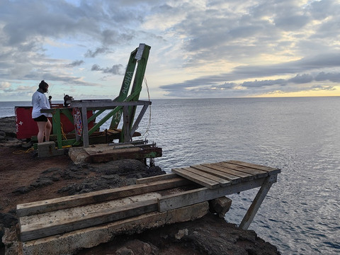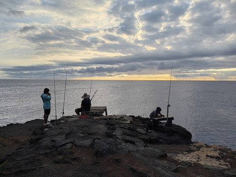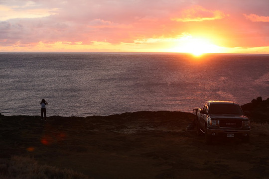 没有了柏油路面,是坑洼不平的土道,一些车辆散落停在周边。海浪拍打着崖壁,激起阵阵浪花。崖壁岸边搭置跳水的木架,网上说有人在这里跳水,今天没有,倒是有二三个人在钓鱼。此时已近黄昏,太阳在天的尽头,即将坠入太平洋。天上的火烧云卷曲着扭动,泛着金黄色,阳光打在人脸上一片金黄。