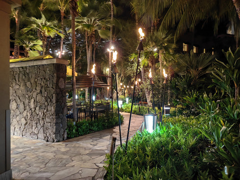 然后从潜艇回到游轮,返回码头。返回后,沿威基基海滩闲逛,游逛卡拉卡瓦大道。卡拉卡瓦大道上各种商店、餐馆、酒吧、酒店林立,晚上人很多,来来往往,还有白天看不见的卖艺的,在路边吆喝。人多路不宽,但又很有秩序,不时看见闪着蓝色警灯的警车疾驰而过。路两旁一排排椰树之间,树立着一人多高的杆子,但上面不是灯,而是火把,不太懂。