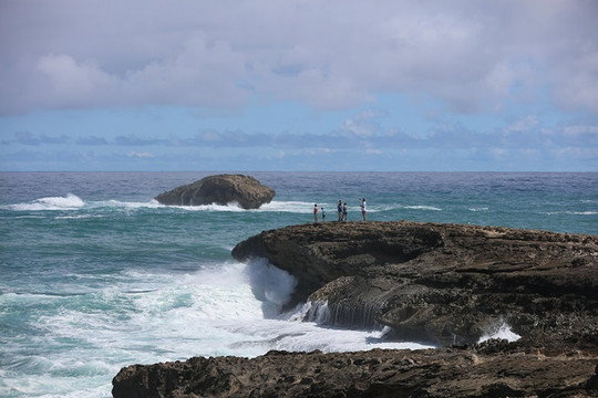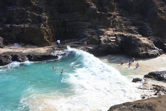 Halona Blowhole Lookout停车场较大,免费停车。在观景台的左侧可以看到不远处的桑迪海滩Sandy beach。这里风浪较大,汹涌的海水从观景台下面的一处岩石的孔洞中形成一道水柱喷涌而出,犹如一条鲸鱼在呼吸,非常的壮观。右边有一个小海湾,海浪从外面涌进海湾,形成大浪,一些游泳者泡在海浪里,与海浪一同起伏,非常享受。
