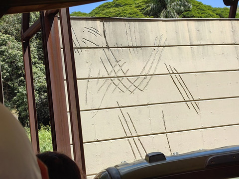 从酒店出发,大方向是朝东北进发。出市区,走高速,转入乡间公路,穿过隧道,来到岛的东面。路况很好,车辆时多时少。到古兰尼牧场,看见牌子左转进入停车场。上台阶进入屋内,是个售卖各种纪念品的超市,穿过房屋出来,正对面圈着很多马,是供骑马之旅。房屋后面郁郁葱葱的大山压顶,仿佛利爪挠过,竖起多道龙脊。左转有几个窗口,大家排队换票,看见一辆辆绿色大巴(有点像换了颜色的校车)依次开出,进入深山。