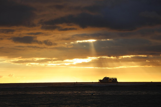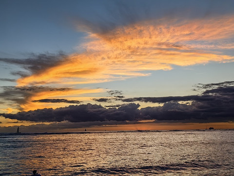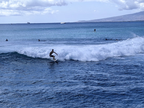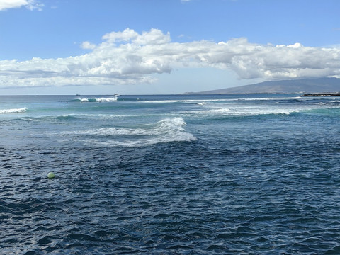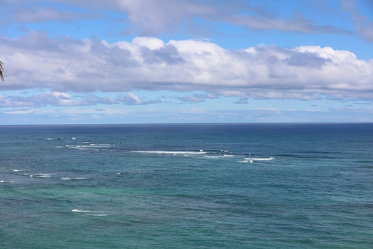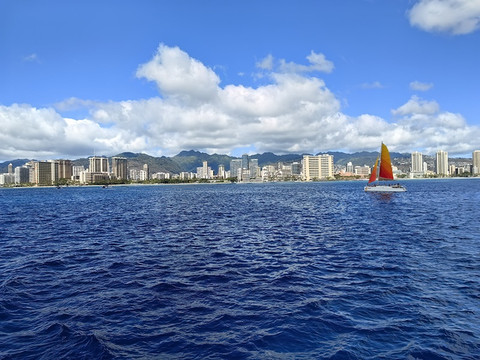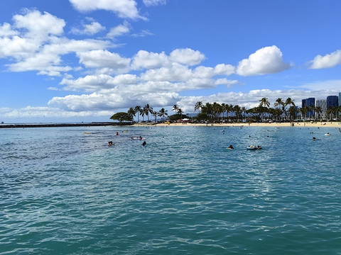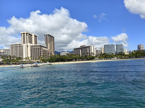 我们定的是14点的时间,要求提前半小时到达,实际也不用太早。在码头等待时候,可以欣赏两边的海滩,透明见底的海水波浪起伏,近处呈现碧绿色,向远处逐渐过渡成深蓝色,远处海浪一道道掀起,不少冲浪者在海浪间穿梭冲浪,令人羡慕不已。不久,一艘轮船驶来,水手迅速用缆绳系住轮船,熟练帅气的手法吸引了大家的目光。船有两层,下层在室内有排排座椅,二层是室外,视野开阔。船启动后,我顺着楼梯来到二层,船缓缓离开码头向大海深处驶去。碧绿的海水中一只海龟浮到海面上,从轮船边划过。轮船晃动着经过道道波浪,全速驶离海岸。威基基海滩的层次感逐渐显现,天上白云朵朵,远处层层山峦,中间高楼大厦,近处椰林海滩,浅滩上游客戏水,美景如画。