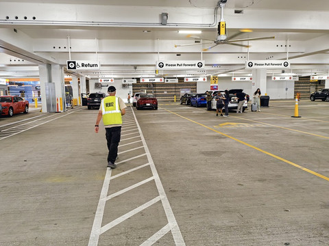 早8:30出发,沿高速前往机场。接近机场时,跟着“Rental Car Return”的指示牌走,就能到租车停车场。车辆进入Hertz停车场后,会有人引导停车,核对小票信息。此时,我们发现又收217.8美元,交涉无果,我们就先还车了(后来经租车网站和我们共同交涉退回多收款项)。