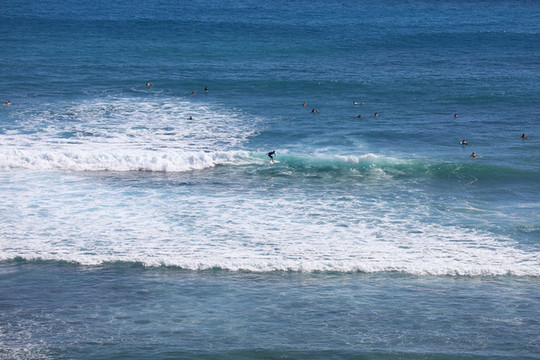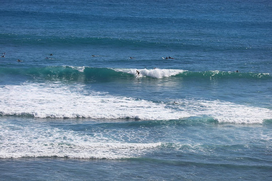 停车场周边的道路都是高大的椰树,海滩边有度假酒店、酒吧。我们在海滩看了一会风景,人挺多,还是浪很大。