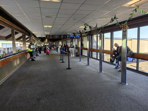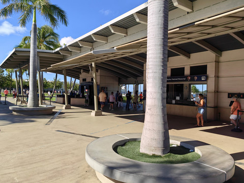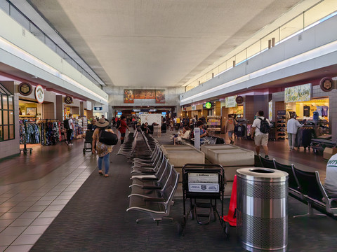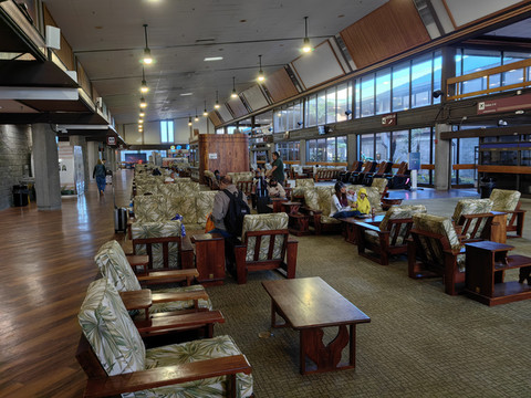 檀香山国际机场有3个航站楼(T3为国际航班,T1/T2为内陆航班),机场内有接驳bus穿梭于航站楼间(大概15-20分钟一班车,服务时间: 6:00到22:30),旅客也可以选择步行穿越。(航站楼间最远距离大概步行20分钟)(摘自网上)。
