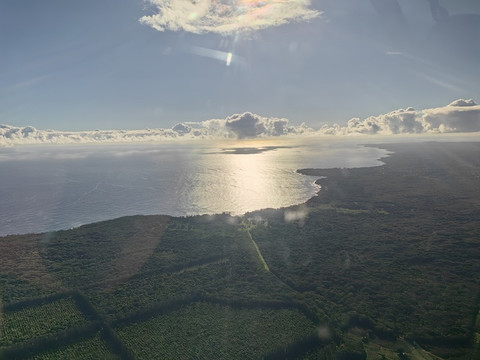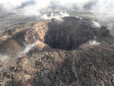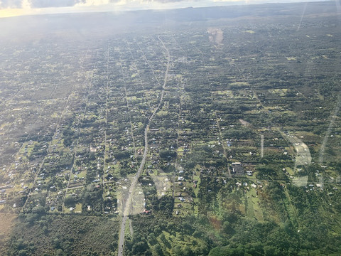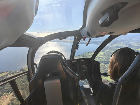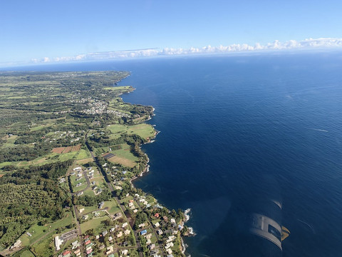 升空后,片片棉絮般白云飘在脚下,大地上呈现大片村庄、树林,弯曲绵延的乡村公路上跑着蚂蚁大小车辆,远处的太平洋在阳光下泛着波光。不久,来到一处火山口,黑漆漆的火山口犹如月球的环形山,张嘴向天。基拉韦厄火山口形成的巨型火山坑硕大无比,许多裂缝处飘着白烟。远处冒纳凯阿火山Mauna Kea绵延,山上的天文台清晰可见。驾驶员为了让每个人都欣赏到美景,都左右边各飞行一次。飞临狭长的裂谷观看了几个著名的瀑布后,越过一片草地、高尔夫球场,飞到大海之上,缓慢飞向机场,直升机逐渐降低飞行后降落在起飞时的地方。