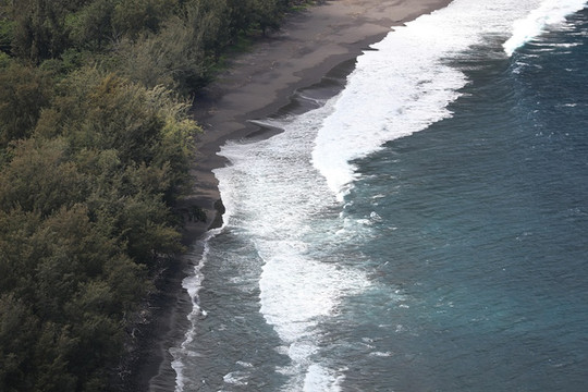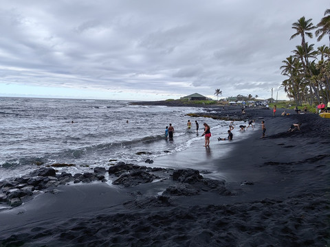普纳鲁吾黑沙滩的深黑色的沙子是火山喷出的炙热熔岩与冰冷的海水相遇时形成的细小沙子。据说在这片黑色沙滩上面,能见到上滩休息的大海龟,我们没看到。