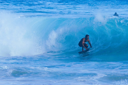 由此向前依次有日落海滩Sunset Beach、鲨鱼湾Sharks Cove、威美亚湾海滩公园Waimea Bay Beach Park、拉尼亚克雅海滩Laniakea Beach等,都是当地知名的冲浪者的天堂、潜水者的胜地,海水清澈、景色怡人,游客众多。各地之间相距几英里,车程不超过10分钟。海滩都差不多,我们有选择的稍作停留,即前往哈雷瓦镇Haleiwa。