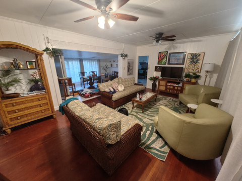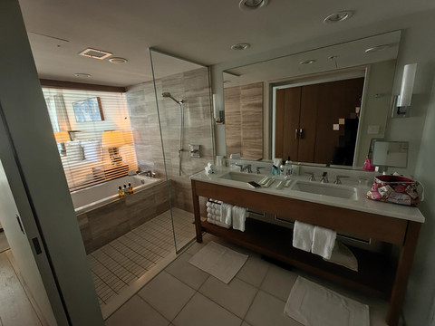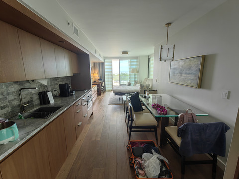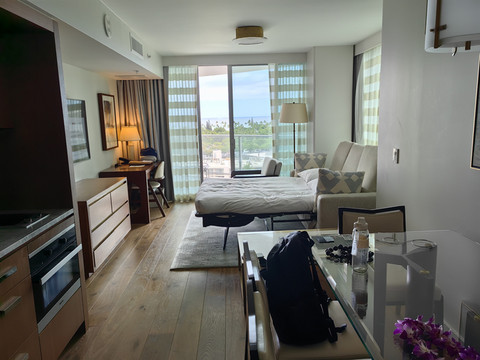住宿是一共8天,其中大岛3天,是孩子定的民宿,一个独立的平房,四个卧室,两个厅,厨房、卫生间各一,吊扇无空调(体验可以);欧胡岛是丽思卡尔顿公寓式酒店,定的海洋景观豪华房40多平米(入住时,升级为海洋景豪华转角套房),带厨房和洗衣机、烘干机(很实用),在入住后收取存车费每天50美元(5天进出都是代泊取存车)。