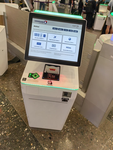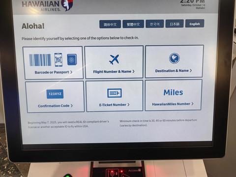 先在自助机打印出登记牌,再选择行李托运,这个过程需要自己操作,自助机可以选择中文界面,可以将行李放到机器右下方的磅秤上过秤,看看是否超重。然后按照中文提示操作,办完后机器自动从卡上扣钱,打印登机牌及行李票后,把行李拿到托运柜台交给服务人员。夏威夷的岛间飞机需要另付行李托运费,夏威夷航空标准是一件行李25美元,50磅以下就行(23公斤),超重部分费用很贵。听说入会夏威夷航空,行李会便宜,我没操作。