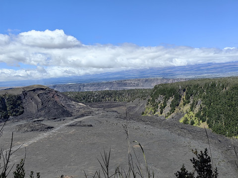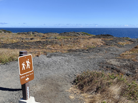由此再向前行驶约5分钟来到毁灭小径(Devastation Trail),这条路是1959年“小基拉韦厄”喷发时形成的熔岩喷泉及火山灰烬覆盖的地方。车辆停在外边,步行1.6公里往返,游玩约20-30分钟,铺砌好的小路。我们到时,道路封闭,不能进去。只好左转沿直达海边的火山口链路,去霍雷海拱(Hōlei Sea Arch)。