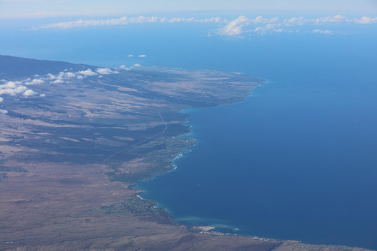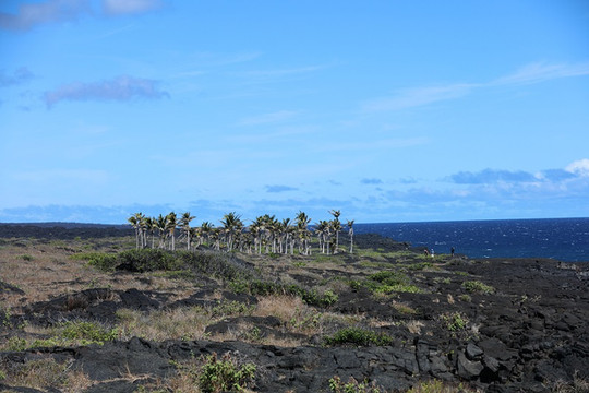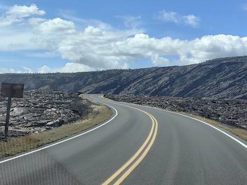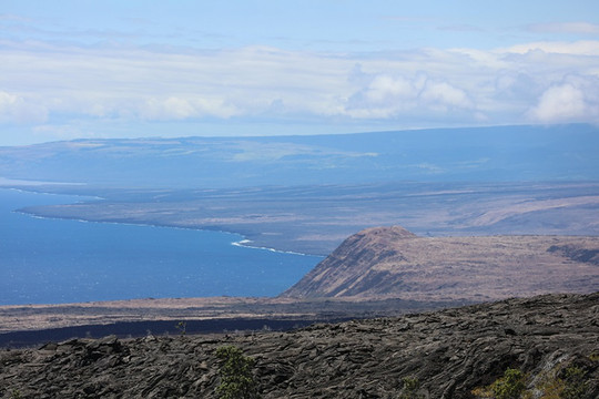 沿着链路从基拉韦厄火山南坡一路南下,可以一直开到海边,一路上先是在树林中穿梭,后行驶在熔岩上铺就的道路,车辆稀少,一路下坡,路况俱佳,风光无限。车从山中转出来,远处是深蓝色浩瀚的太平洋,路的两侧是各个年代形成的黑色熔岩,因为是从山上下来的大下坡,感觉太平洋竖起来,非常震撼。