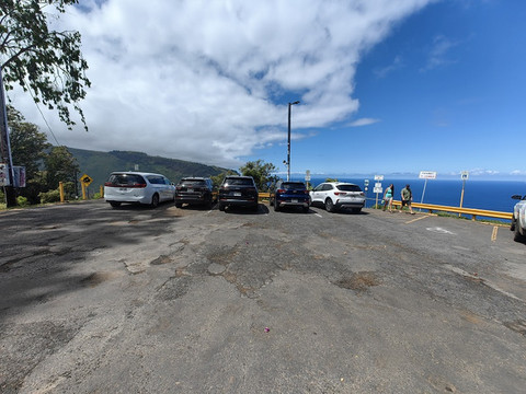从希洛出发,沿着19号公路行驶1个多小时,到达怀皮奥山谷地区。公路的一侧是山崖,另一侧就是海岸。19号公路在霍诺卡(Honokaa)转入240号公路,走到公路尽头有一免费停车场,就到了怀皮奥山谷(Waipio Valley Overlook),停车场不大,有指示牌要求停车在半小时以内,好在大多数车辆停车时间较短。从停车场向下走一段阶梯就是观景台。放眼望去,左边是峡谷里的草原、沙滩和高耸的悬崖,右边太平洋呈现不同颜色,波光粼粼,景色震撼。