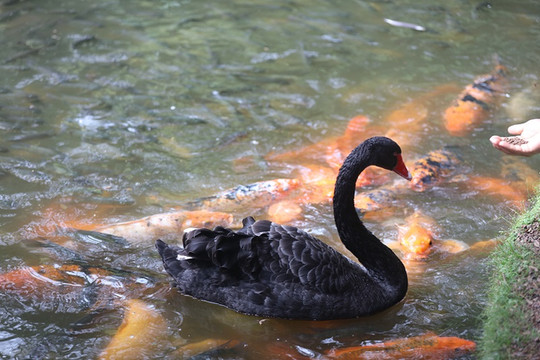走过小桥,听到阵阵钟声,原来有一些游客在敲一口大钟,我们也排队敲了几下。寺庙整体红色基调,木质结构,寺前是一个不大的湖,湖里有大群锦鲤争食,湖面几只天鹅、鸳鸯在游动。