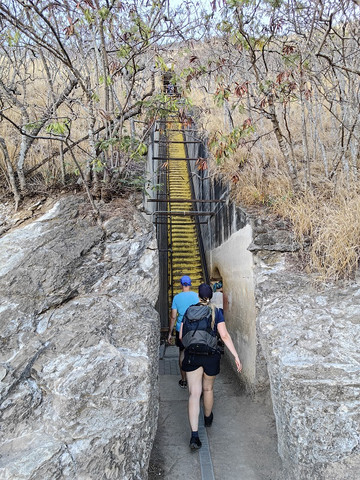 刚开始的爬山小径是水泥地面,平坦易行,后来是石头土道,有些坑洼,特别是山顶部分路段的楼梯非常陡,上山楼梯有三段,大约每段六七十阶,还要走过一个比较昏暗、狭窄的隧洞,从停车场到山顶的单程距离为0.8英里(1.3公里)。
