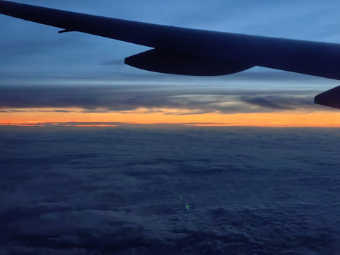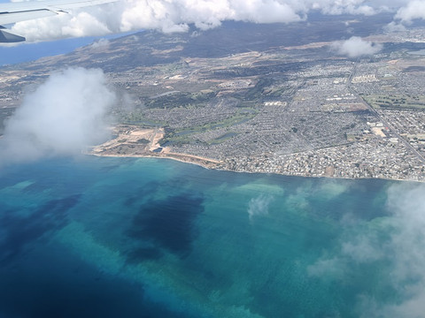 在仁川机场停留6h30m,我们就在登机口休息等待。晚上8点多乘OZ232航班,仁川机场T1—火奴鲁鲁机场T2 ,20:20—10:10(8h50m),实际起飞时间20:54,到达9:46(当地时间)。由于时差原因,到达火奴鲁鲁日期还是10月14日(北京时间比夏威夷早18个小时)。坐在飞机左边,在飞机降落时能看见珍珠港。