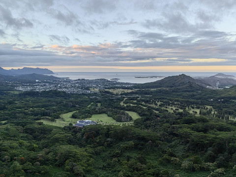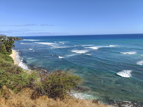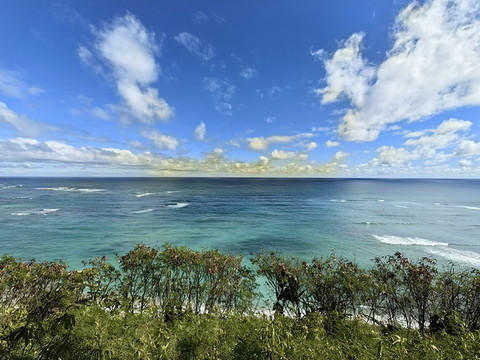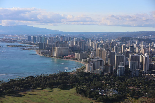 山顶风光秀美,一望无际的太平洋泛着各种蓝色,长条状的威基基海滩向前伸展,檀香山的高楼大厦林立,右侧的山峰起伏,令人心旷神怡。