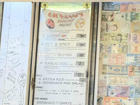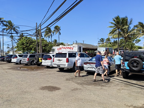 在这里吃有名的奶油虾,就是一个餐车。一辆有很明显的Giovanni's Shrimp的标记餐车停在路边,背向公路的一面有售卖窗口,有一个棚子,里面许多桌椅,大家在此用餐。在卖奶油虾的餐车附近还有很多别的餐车,大家都是因为奶油虾慕名前往,主打是虾饭。Giovanni's Shrimp的餐车人最多,排一小会儿队,虾饭一份16美元,只能支付现金。一个碟子上几个饭团和十多个虾,个人感觉味道一般吧,比较新鲜,就是网红。大家用餐后都自觉的将碟子、纸巾放入垃圾桶中,虽然人来人往,桌面干干净净。