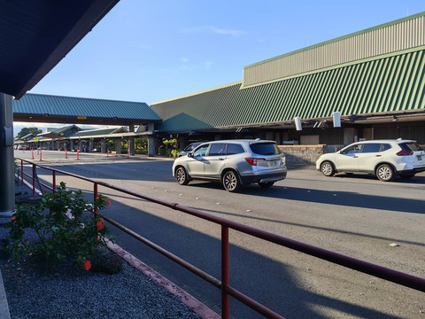 乘HA352航班(15:25-16:20)到大岛希洛Hilo机场,实际15:48起飞,16:16到达,只用了28分钟。希洛机场很小,但很有特色,一排两层外延斜坡的绿色房子,一个行李盘在候机楼外边,紧挨马路(只有一个行李盘)。