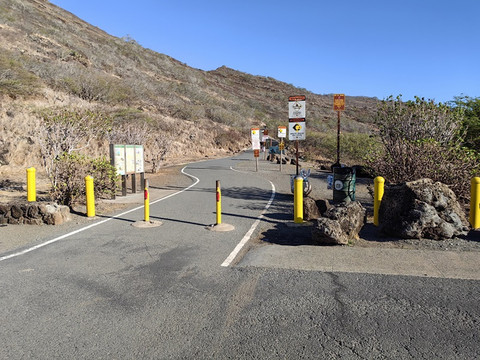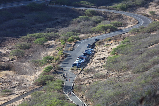 8:00出发,前往钻石头山停车场,3.3英里(5.3公里),车程17分钟。从主路右转进入小路,不久看见隧道,左侧是一个小型停车场(八九个车位)和一个观景台Kahala Lookout,经过隧道进入钻石头山的火山口内,隧道口有红绿灯,实行单向通行。进入停车场前,需交费,才知道,游览钻石头山要提前预约。只好掉头出来,因为要去阿拉莫阿那中心,就在手机上约的下午4点到6点。