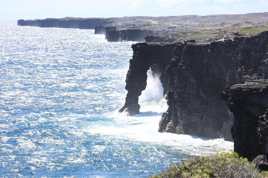 上车继续前行,路过Pu'u Loa 岩画(Pu'u Loa Petroglyphs)。已有500多年的历史,有夏威夷最大的岩画场,共有23000多幅岩画。因为是条徒步来回1.5英里(2.4公里)的线路,就没停车。不久来到霍雷海拱(Hōlei Sea Arch),这里有一个在海里的高约27米象鼻子拱,这个拱是100多年前熔岩从高处流下,表面冷却后形成的。到海拱就到路的尽头了,海拱在火山之路最南端,车就不能前行了,人可以徒步进入,网上说从这里可以步行到流动岩浆入海的地方,全程16公里。这里的海边是不太高的悬崖,海浪挺大,拍打着海岸,海风也大,尽量远离悬崖。