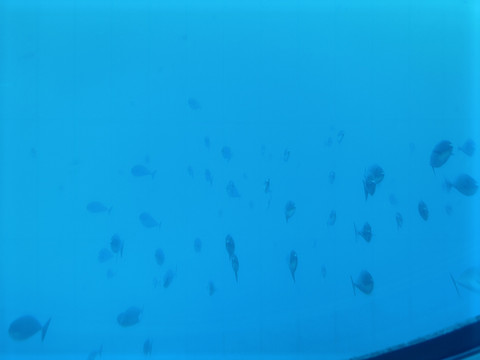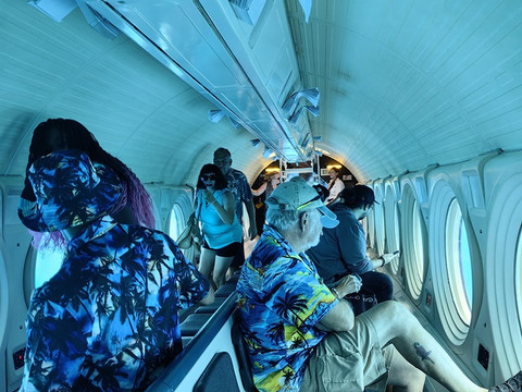 感觉船开了好久,一名工作人员指着不远处的海面说了什么,我就定睛看着,不一会儿,海面泛起白浪,忽然一艘观光潜艇跃出海面,引起人们呼声。两船停靠一起后,大家依次顺着楼梯进入船舱(楼梯是垂直的)。舱内有两排座椅是背靠背的,游客坐下后面对着舷窗。每个人面前都刚好有一扇透明舷窗,可观赏海底世界。游览时间大约1小时30分钟(潜艇45分钟)。