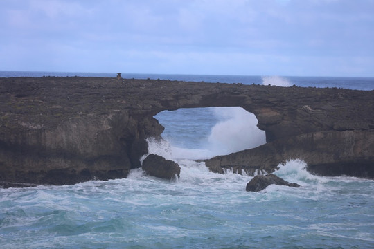 这里有几辆车,可以沿礁石向里走,虽然是蓝天白云,海浪却汹涌澎湃,拍打礁岸激起阵阵浪花。远处有一个岛,中心空洞,像一个门洞,经历着滚滚海浪。
