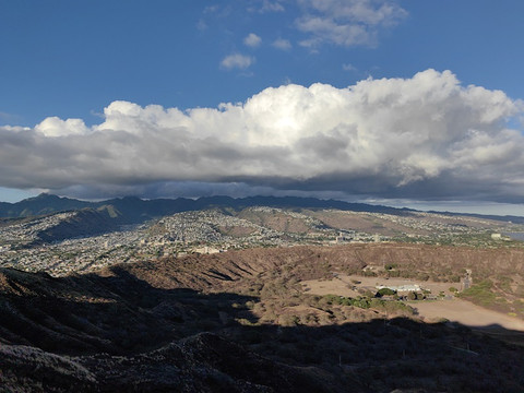 钻石头山Diamond Head State Monument位于欧胡岛威基基海滩东南海岸,夏威夷最知名的地标,以其历史悠久的徒步旅行路线、迷人的海岸景色和军事历史而闻名。这个宽阔的蝶形火山口形成于大约30万年前,喷发的火山灰和细微颗粒降落下来形成凝灰岩,在公园小径上可以看到。山顶可见碉堡,和山下灯塔以及整个威基基海滩、城市,360度饱览海景、山景、城市景观。