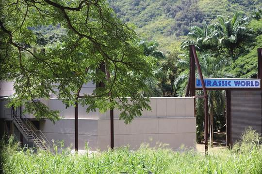 接下来,汽车到侏罗纪电影拍摄过的地方都停下来,讲解当时情景,给众人拍照留念。在侏罗纪公园第一集中,有格兰特博士带着两个孩子在草原上奔跑,躲到一棵躺着的枯树边的场景。驾驶员让一家人站在枯树前,做出恐惧的姿态,他则左手套着恐龙头,右手持手机拍照,很有意思。车子时而在山谷中行进,时而盘上山坡,一路土道,看到许多拍摄地。