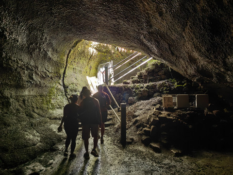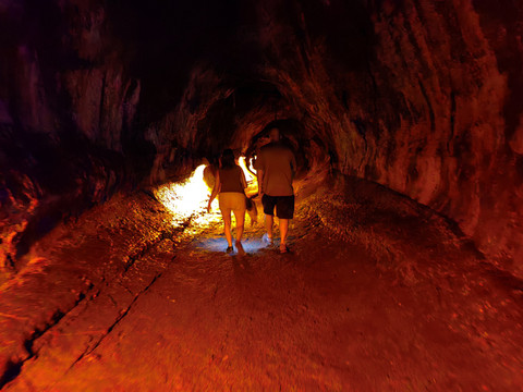 听说瑟斯顿火山熔洞(Thurston Lava Tube)10点以后会有大型车辆,游客会多,遂决定就先去这里。出游客中心向南行进,路过公园入口(不出去),未记时间,大约十分钟之内,看见一个停车场是Kīlauea Iki overlook Parking,建议将车辆停在这里,沿着crater rim trail走去熔洞。因为熔洞停车场非常小,停不了车就得继续前行很远才能掉头。停好车后(注意车中不要放包之类物品,以免被盗),在树林中行进大约十分钟左右,一路上在树林里,不晒,沿途有观景台,可在高处观看火山形成的巨型大坑。来到小基拉韦厄火山口徒步入口(Kīlauea Iki Crater),过马路,就是瑟斯顿火山熔洞,跟着指示下行入洞。熔岩通道的形成是:炙热的岩浆流经地下通道,外围的岩浆冷却后形成了坚硬的壳,形成类似溶洞的空间。这是条环线步道,约1.2公里,部分台阶和坡道,约20-30分钟,里面照明是红色的,很昏暗,注意脚下坑洼的路,有的地方有水洼。出洞口上台阶,又回到马路边。有时间的朋友还可以在对面向下到熔岩地面,徒步行走。